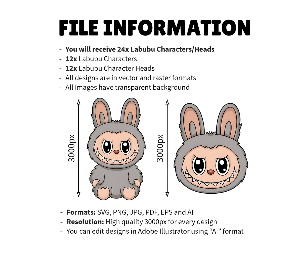 You will get: 24x Labubu Character/Heads Designs - 12x Labubu Characters - 12x Labubu